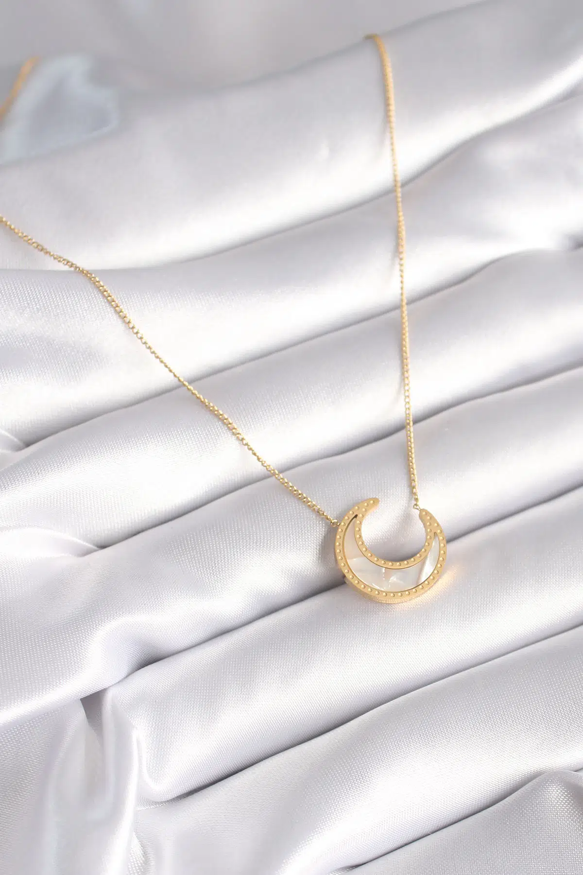 | Etiketler | 316L Çelik Gold Renk Beyaz Sedefli Hilal Model Kadın Kolye |