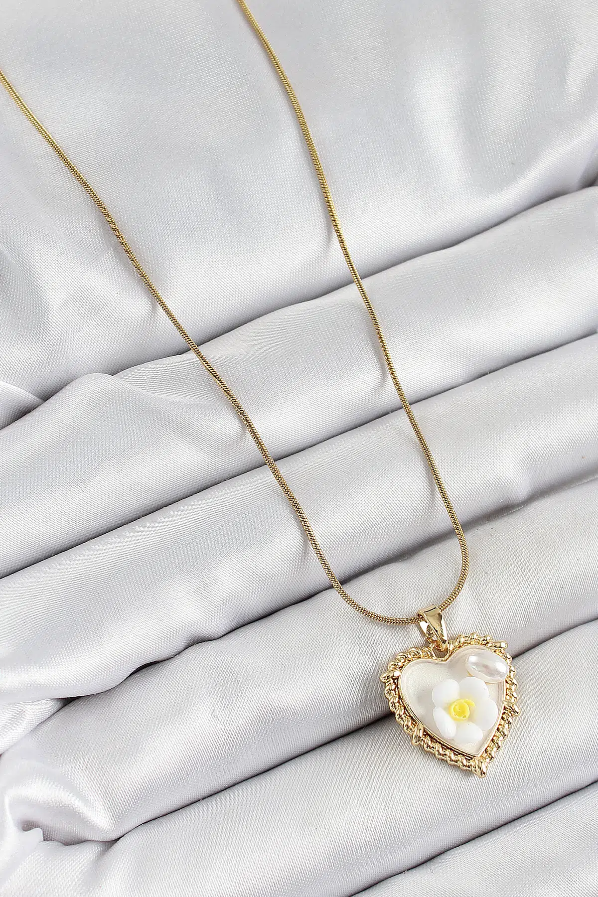 | Etiketler | 316L Çelik Zincir Beyaz Sanatsal Portre İnci Detaylı Papatya Figürlü Kalp Model Gold Renk Kadın Kolye |
